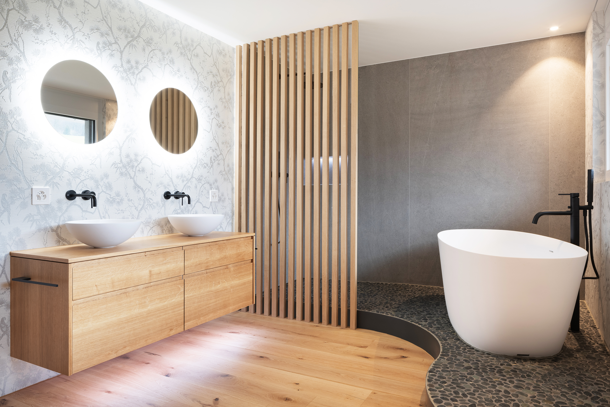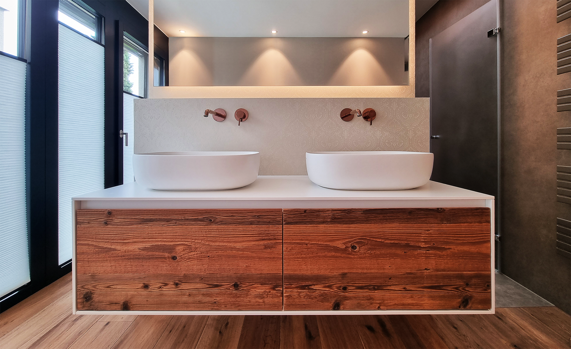 Im Pflegebereich zählen Sauberkeit und Sicherheit. Deshalb verwenden wir in diesem Umfeld grundsätzlich Materialien, welche pflegeleicht, hitze- und feuchtigkeitsbeständig sind. Für alle Oberflächen, die steril sein müssen, arbeiten wir mit Corian. Dieser Verbundwerkstoff besteht aus Mineralien und Acrylharzen, ist hart wie Stein und gleichzeitig flexibel wie Holz.